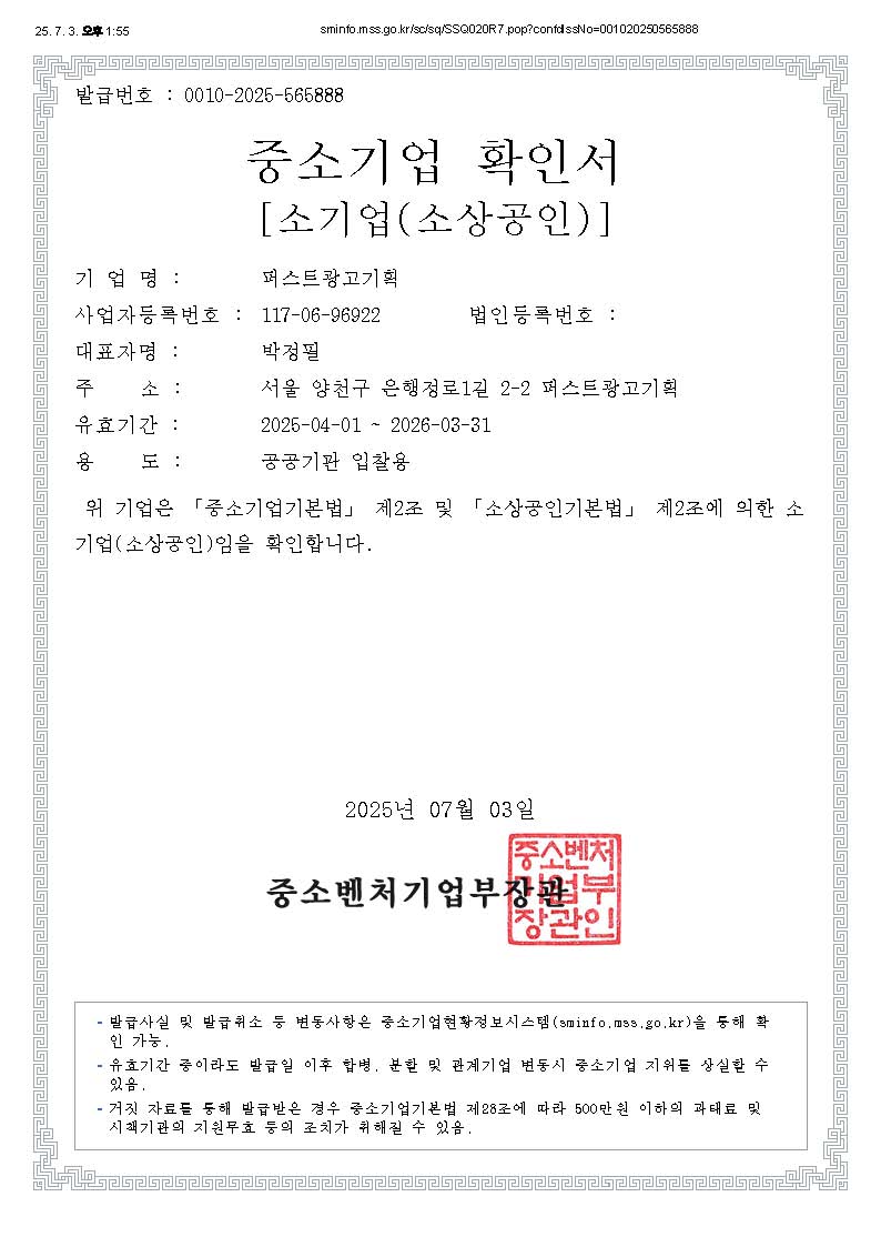 대표이사 : 박정필 ㅣ 주소 : 서울시 양천구 은행정로1길 2-2 ㅣ 사업자 등록번호 : 117-06-96922 ㅣ 대표번호 : 02-2696-6604